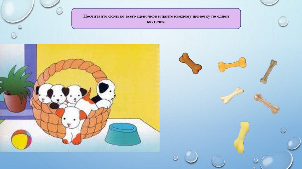 Посчитайте сколько всего щеночков и дайте каждому щеночку по однойкосточке.