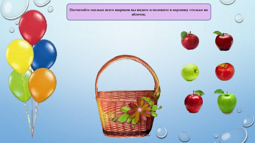 Посчитайте сколько всего шариков вы видите и положите в корзинку столько жеяблочек.