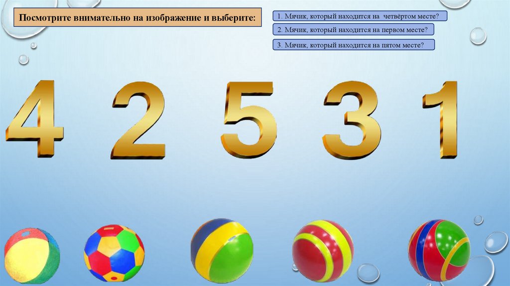 Посмотрите внимательно на изображение и выберите:1. Мячик, который находится на четвёртом месте?