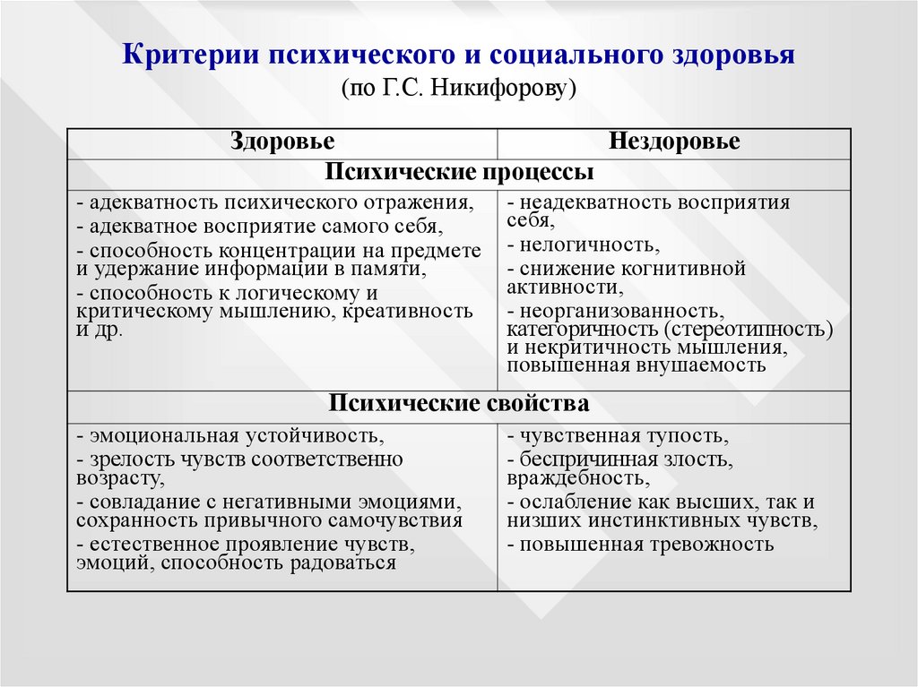 Критерии психического и социального здоровья(по Г.С. Никифорову)