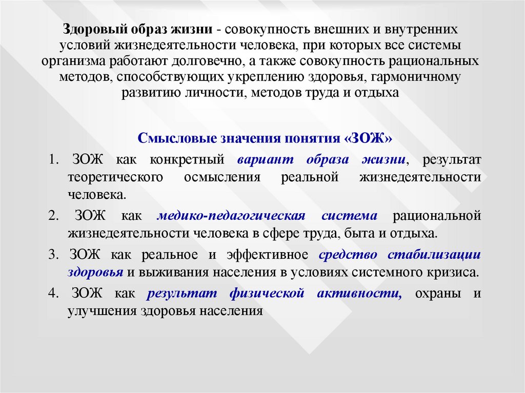 Здоровый образ жизни - совокупность внешних и внутреннихусловий жизнедеятельности человека, при которых все системы
