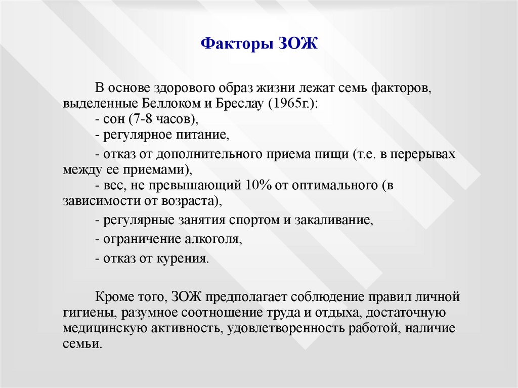 Факторы ЗОЖВ основе здорового образ жизни лежат семь факторов,