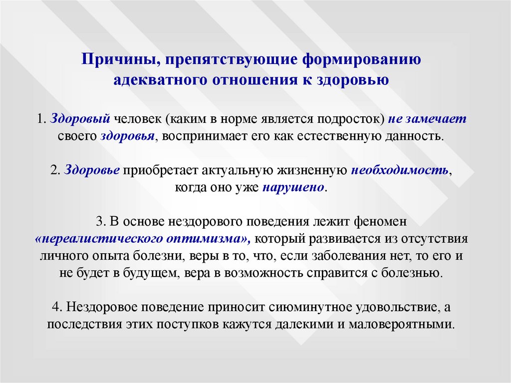 Причины, препятствующие формированиюадекватного отношения к здоровью