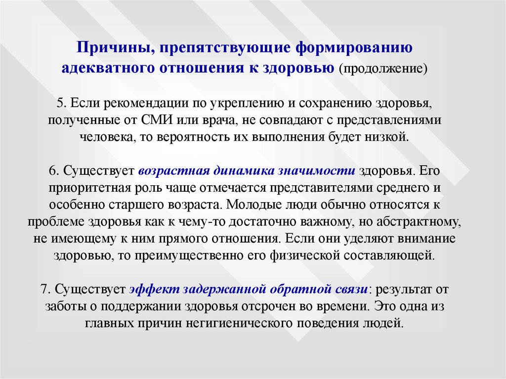 Причины, препятствующие формированиюадекватного отношения к здоровью (продолжение)