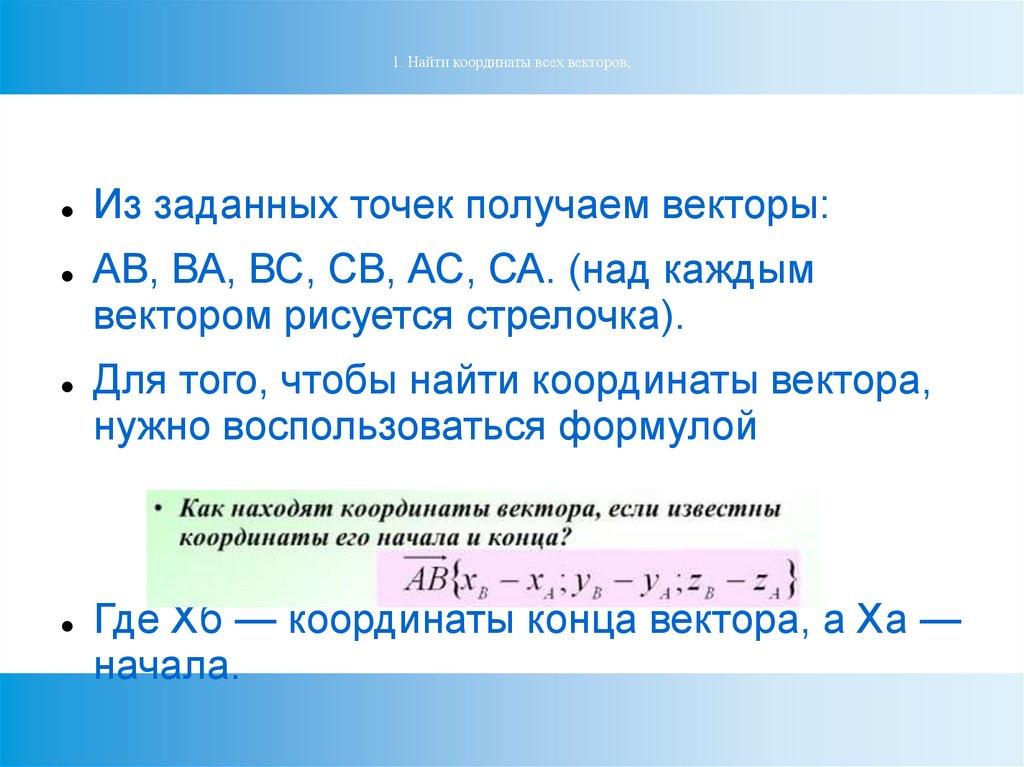 1. Найти координаты всех векторов;Из заданных точек получаем векторы: