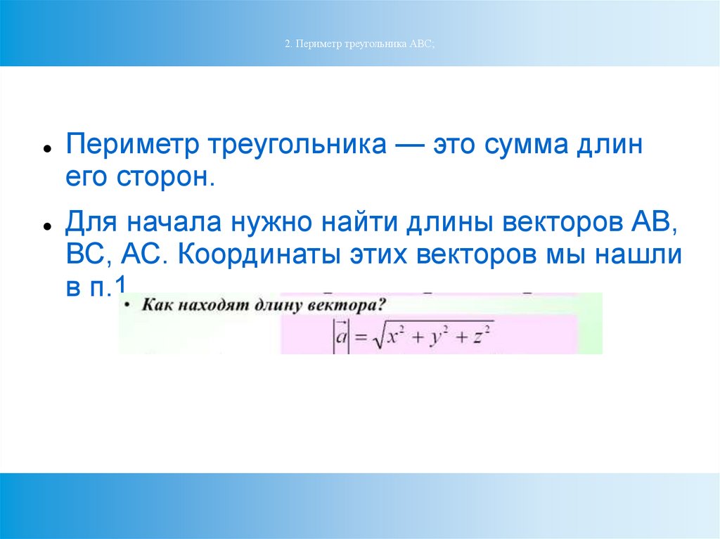 2. Периметр треугольника АВС;Периметр треугольника — это сумма длин