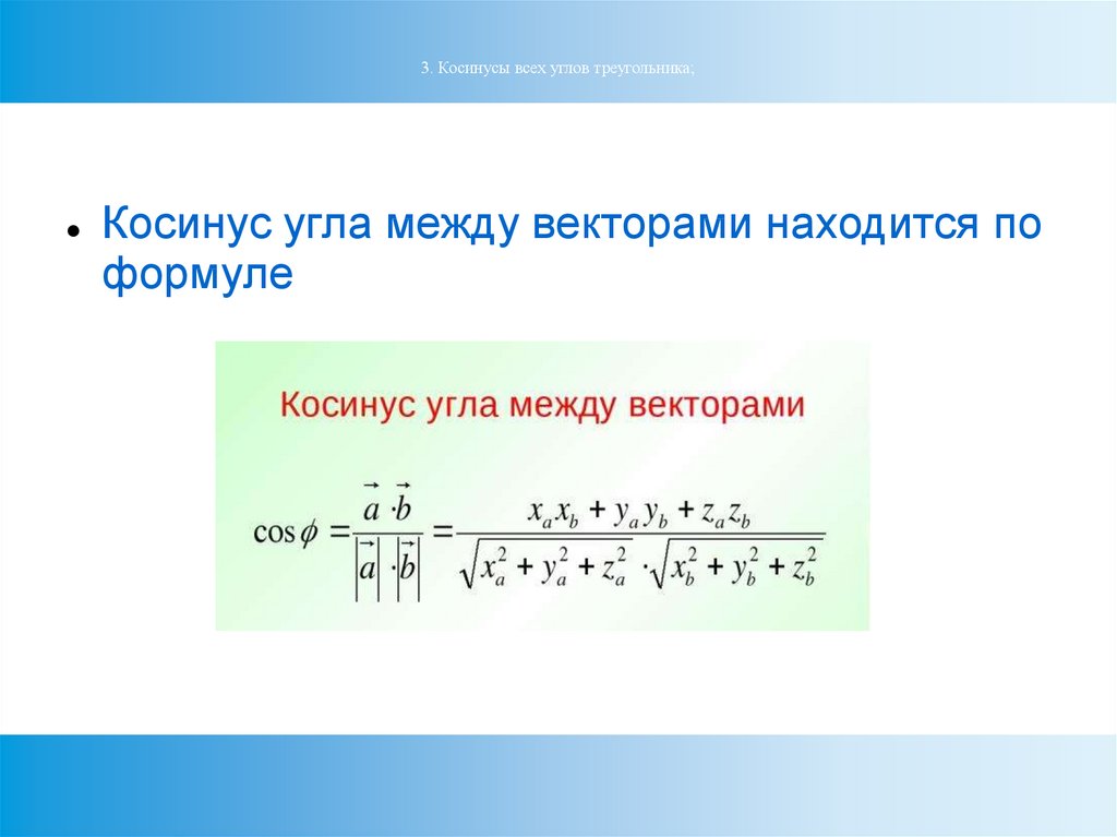3. Косинусы всех углов треугольника;Косинус угла между векторами находится по