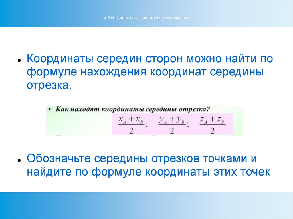 4. Координаты середин сторон треугольника;Координаты середин сторон можно найти по