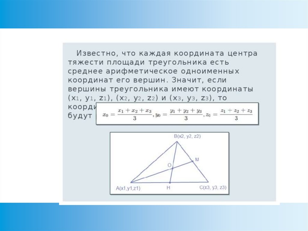 5. Координаты центра тяжести треугольника АВС;Центр тяжести (центроид) треугольника – точка пересечения