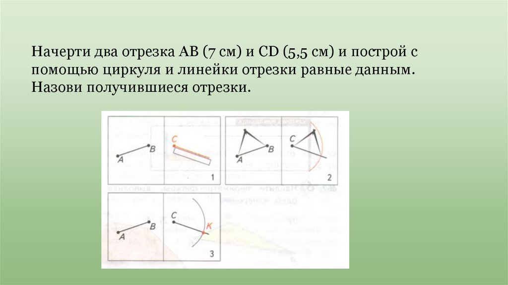 Начерти два отрезка AB (7 см) и CD (5,5 см) и построй с