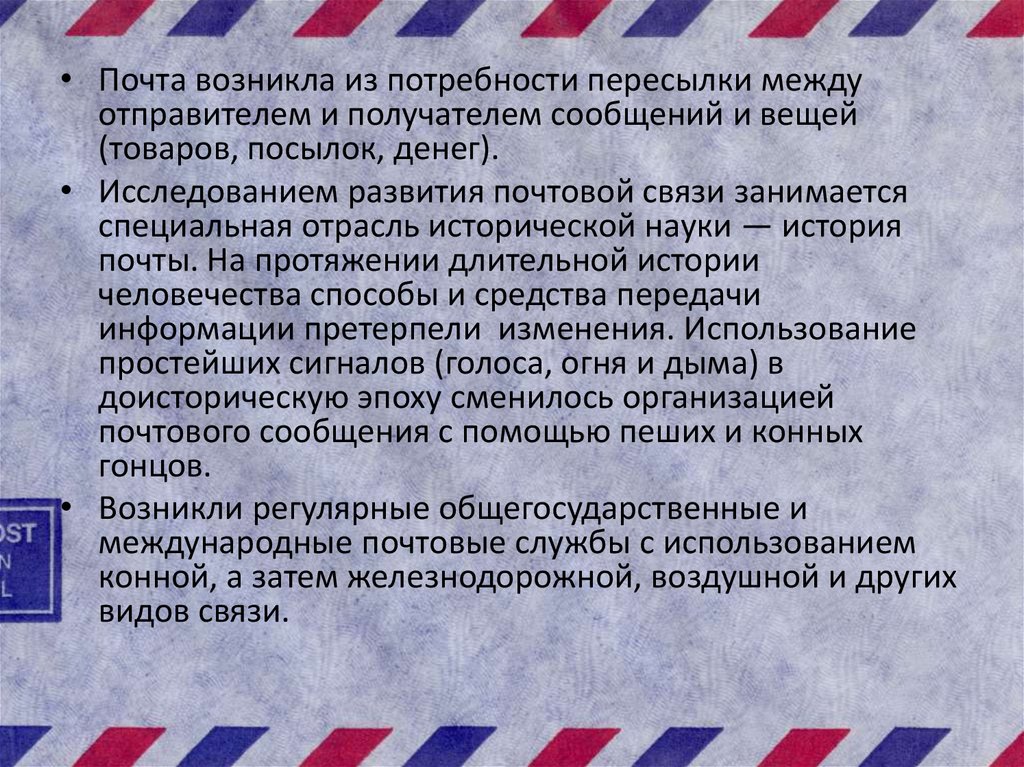 • Почта возникла из потребности пересылки междуотправителем и получателем сообщений и вещей