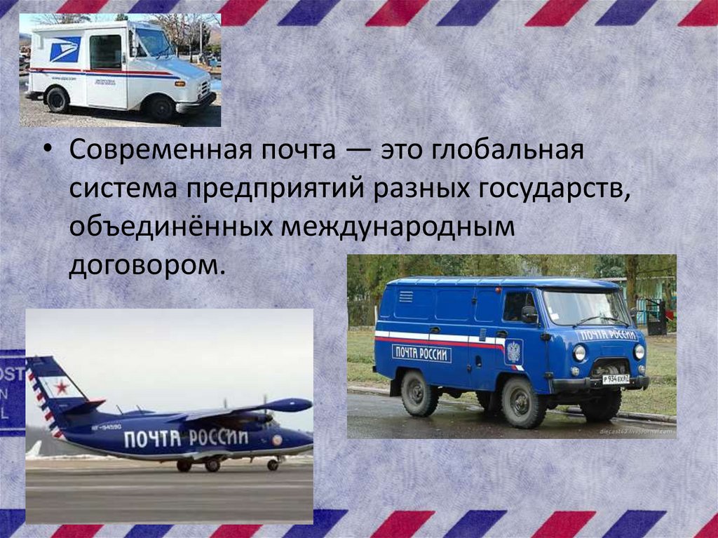 • Современная почта — это глобальнаясистема предприятий разных государств,