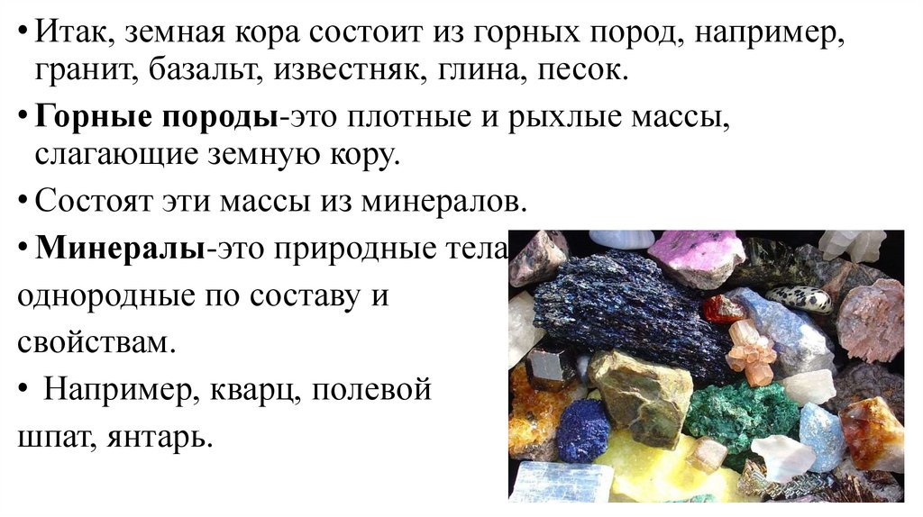 • Итак, земная кора состоит из горных пород, например,гранит, базальт, известняк, глина, песок.