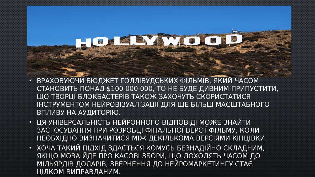 • ВРАХОВУЮЧИ БЮДЖЕТ ГОЛЛІВУДСЬКИХ ФІЛЬМІВ, ЯКИЙ ЧАСОМСТАНОВИТЬ ПОНАД $100 000 000, ТО НЕ БУДЕ ДИВНИМ ПРИПУСТИТИ,