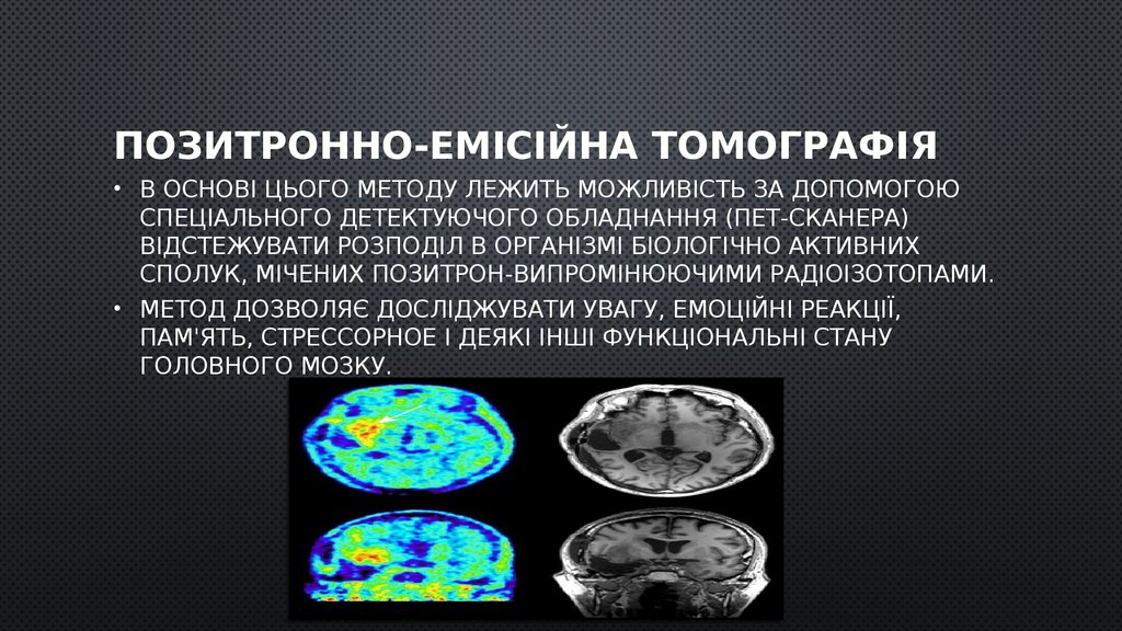 ПОЗИТРОННО-ЕМІСІЙНА ТОМОГРАФІЯ• В ОСНОВІ ЦЬОГО МЕТОДУ ЛЕЖИТЬ МОЖЛИВІСТЬ ЗА ДОПОМОГОЮ