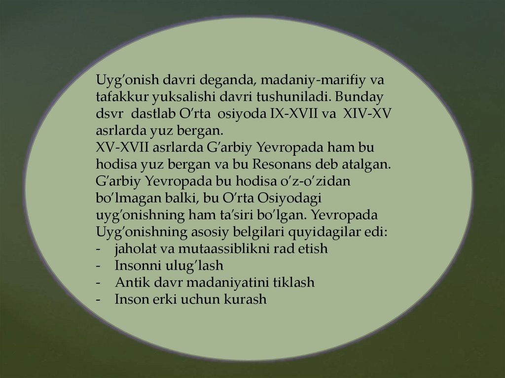 Uyg’onishning asosiy belgilari quyidagilar edi: