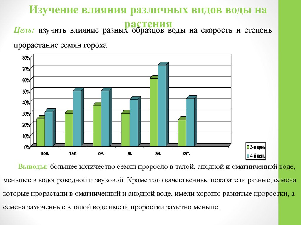 Выводы: большее количество семян проросло в талой, анодной и омагниченной воде,