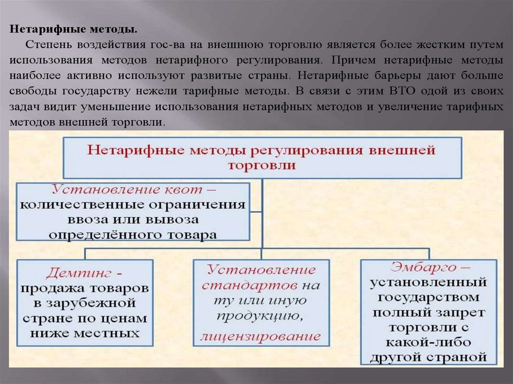 Нетарифные методы.Степень воздействия гос-ва на внешнюю торговлю является более жестким путем
