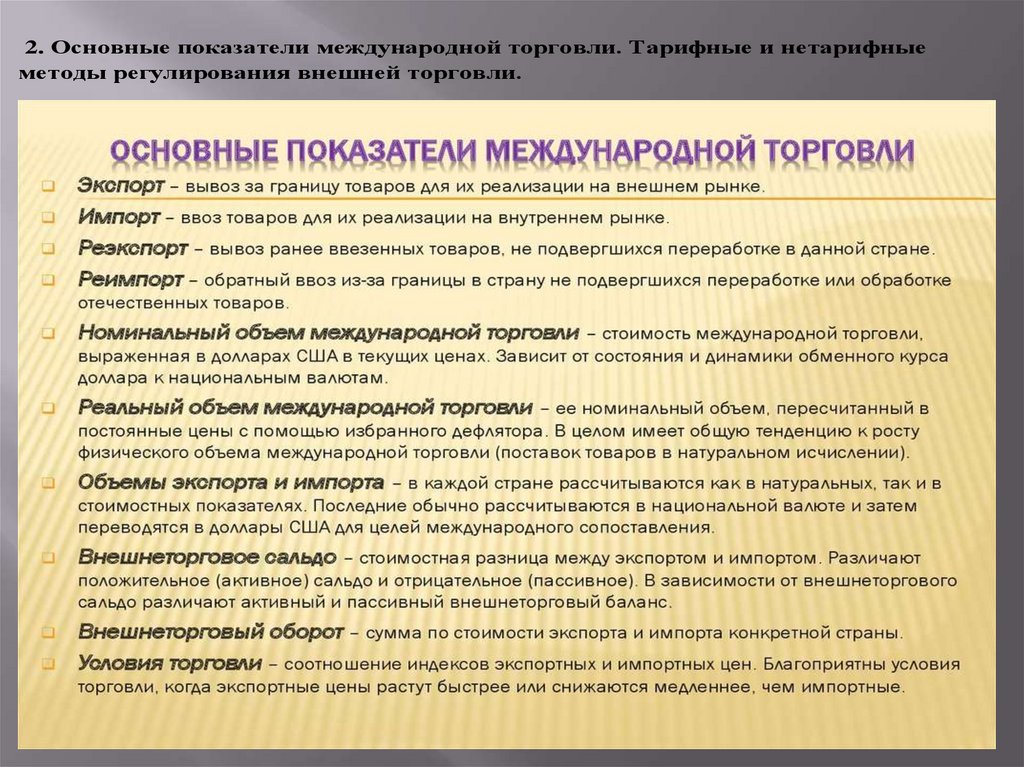 2. Основные показатели международной торговли. Тарифные и нетарифныеметоды регулирования внешней торговли.