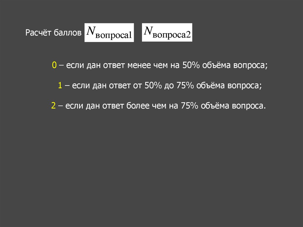 0 – если дан ответ менее чем на 75% объёма вопроса;