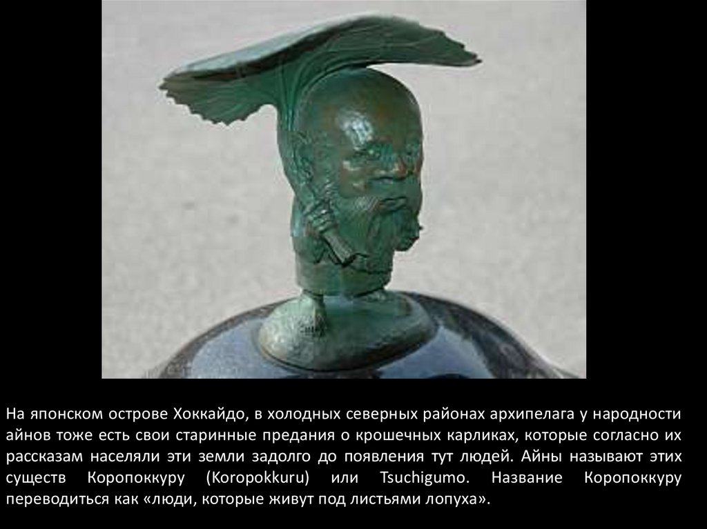 На японском острове Хоккайдо, в холодных северных районах архипелага у народностиайнов тоже есть свои старинные предания о крошечных карликах, которые согласно их