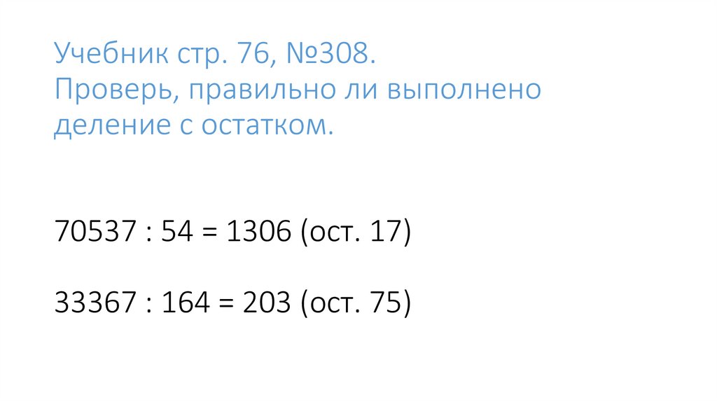 1. Учебник стр. 76, №308. Проверь, правильно ли выполнено деление с остатком. 70537 : 54 = 1306 (ост. 17) 33367 : 164 = 203 (ост.