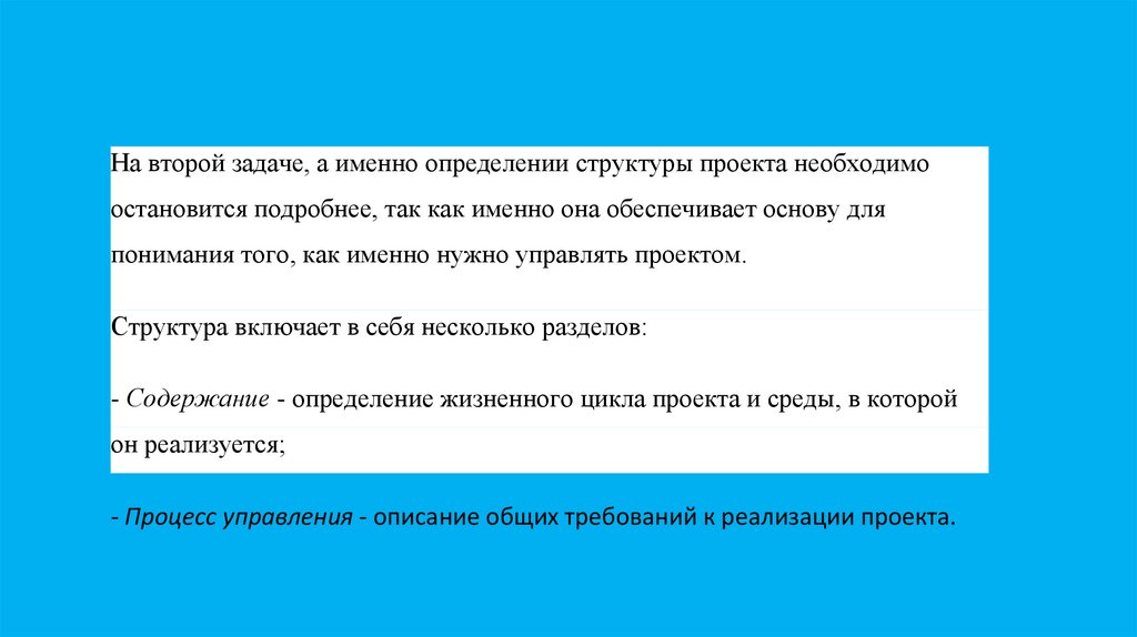 На второй задаче, а именно определении структуры проекта необходимоостановится подробнее, так как именно она обеспечивает основу для