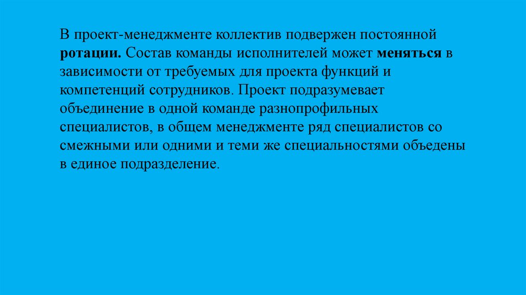 В проект-менеджменте коллектив подвержен постояннойротации. Состав команды исполнителей может меняться в