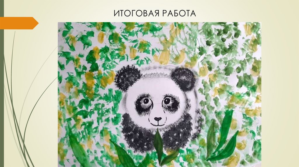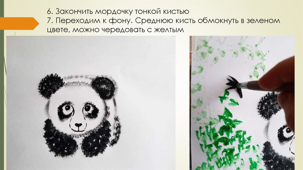 6. Закончить мордочку тонкой кистью7. Переходим к фону. Среднюю кисть обмокнуть в зеленом