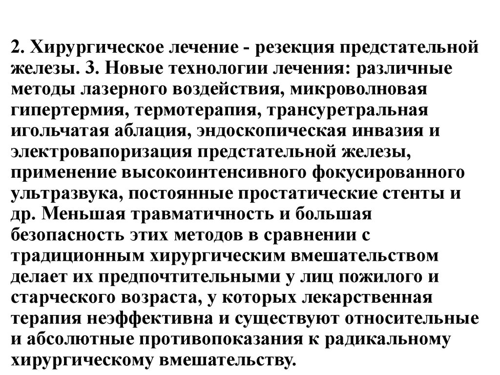 2. Хирургическое лечение - резекция предстательнойжелезы. 3. Новые технологии лечения: различные