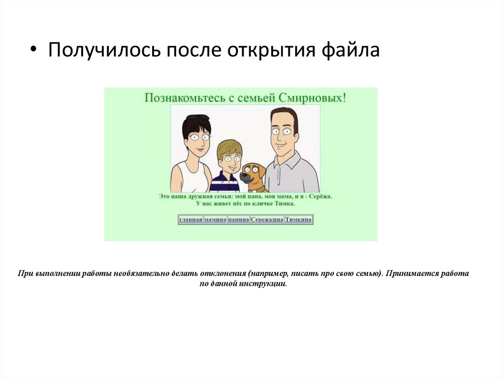 • Получилось после открытия файлаПри выполнении работы необязательно делать отклонения (например, писать про свою семью). Принимается работа