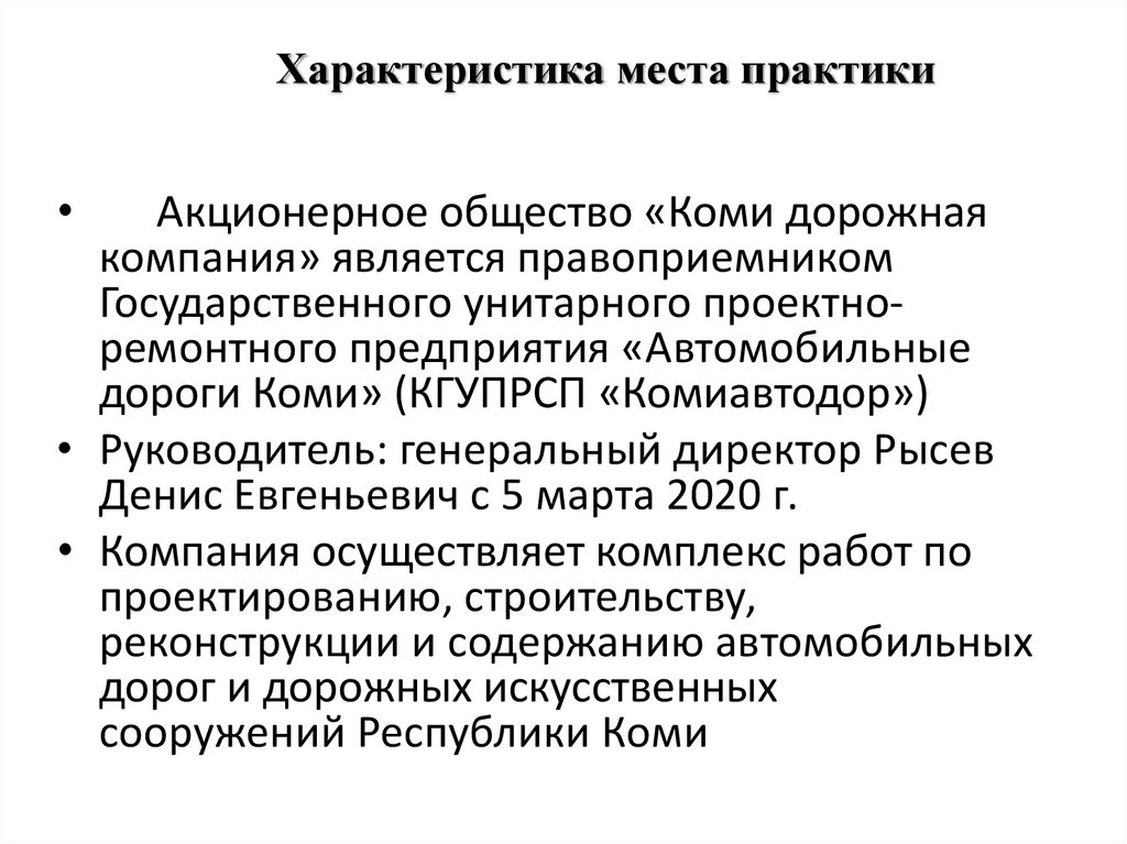 Характеристика места практикиАкционерное общество «Коми дорожная