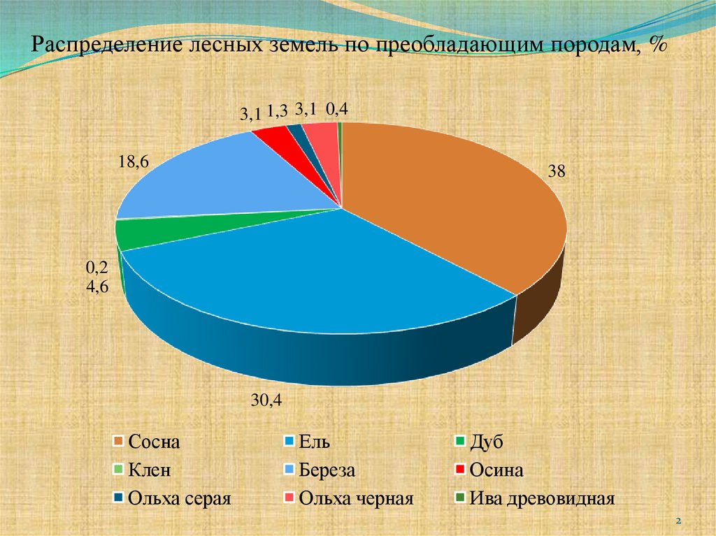 Распределение лесных земель по преобладающим породам, %3,1 1,3 3,1 0,4