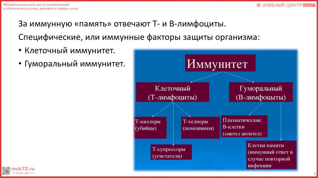 За иммунную «память» отвечают T- и B-лимфоциты.Специфические, или иммунные факторы защиты организма: