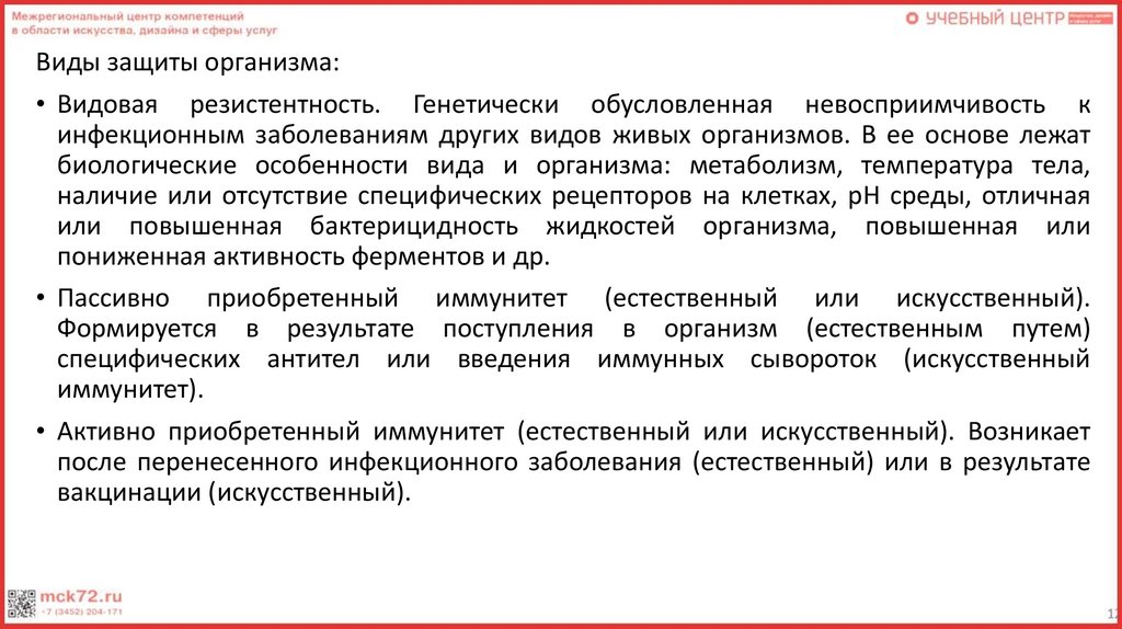 Виды защиты организма:• Видовая резистентность. Генетически обусловленная невосприимчивость к