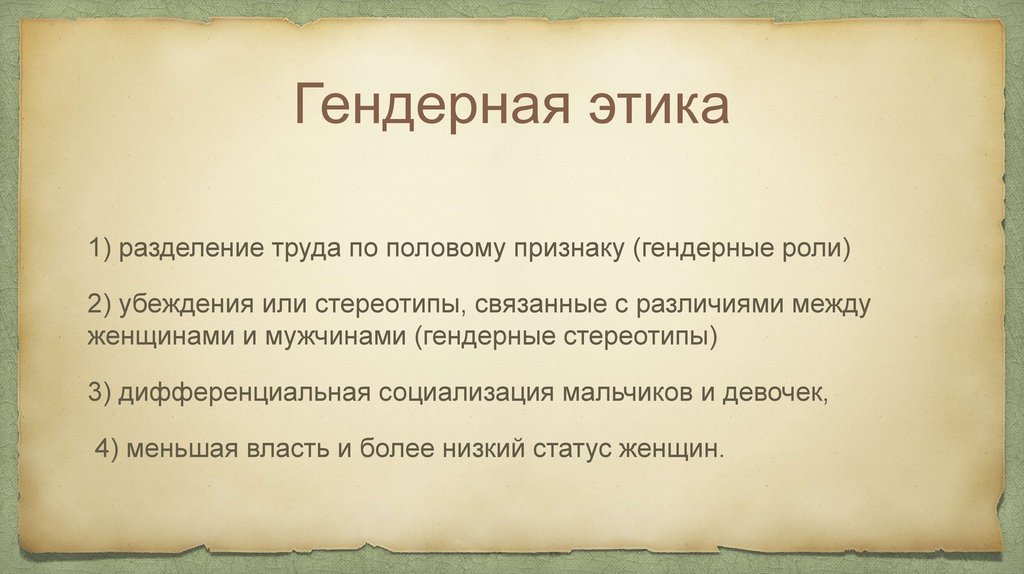 Гендерная этика1) разделение труда по половому признаку (гендерные роли)
