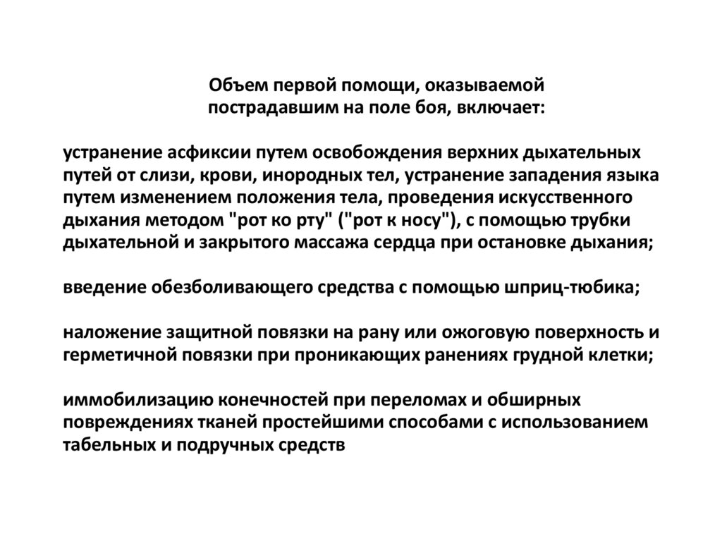 Объем первой помощи, оказываемойпострадавшим на поле боя, включает: