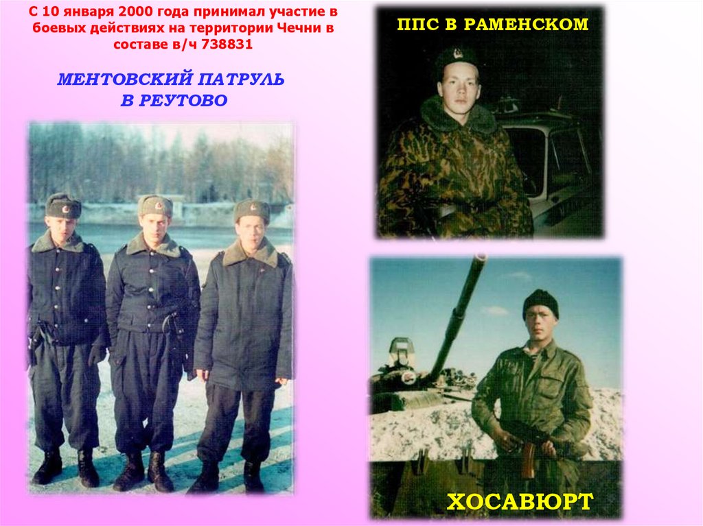 С 10 января 2000 года принимал участие вбоевых действиях на территории Чечни в