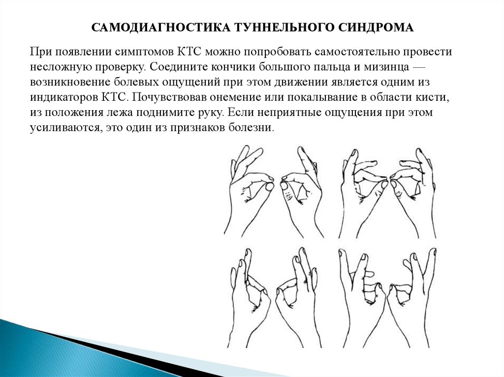 САМОДИАГНОСТИКА ТУННЕЛЬНОГО СИНДРОМАПри появлении симптомов КТС можно попробовать самостоятельно провести