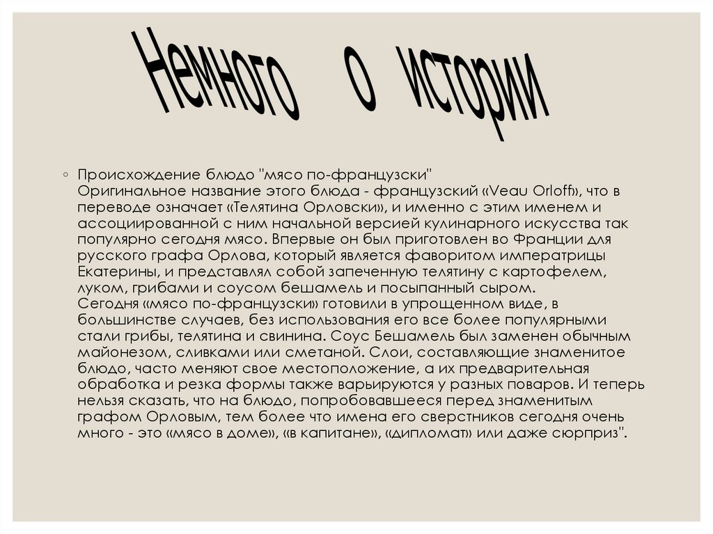 ◦ Происхождение блюдо "мясо по-французски"Оригинальное название этого блюда - французский «Veau Orloff», что в