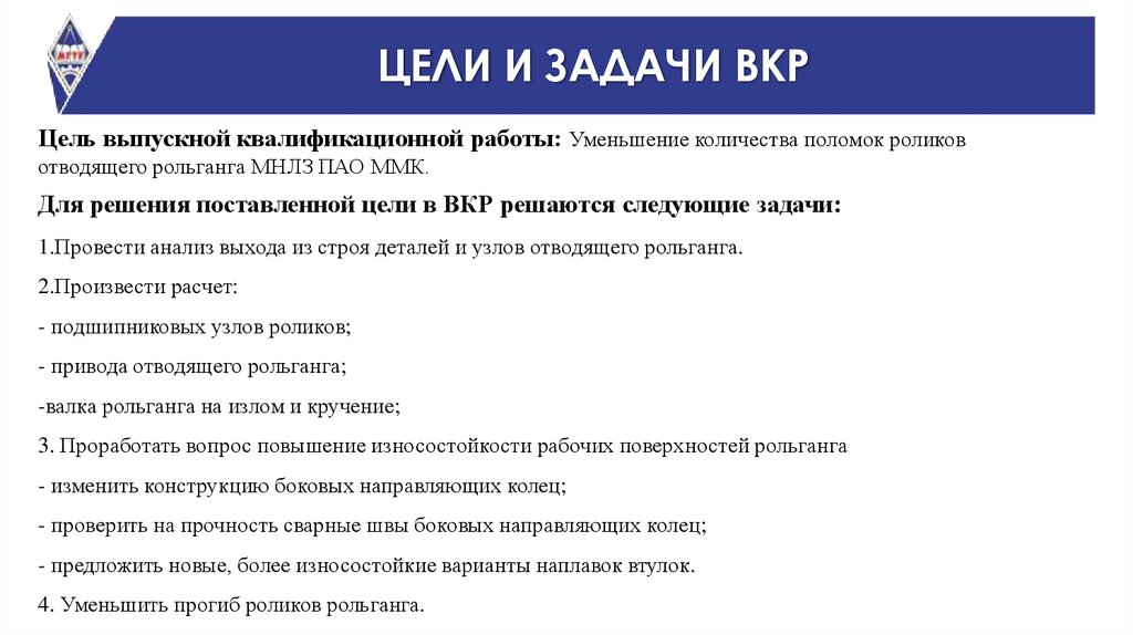 ЦЕЛИ И ЗАДАЧИ ВКРЦель выпускной квалификационной работы: Уменьшение количества поломок роликов