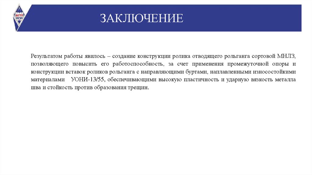 ЗАКЛЮЧЕНИЕРезультатом работы явилось – создание конструкции ролика отводящего рольганга сортовой МНЛЗ,