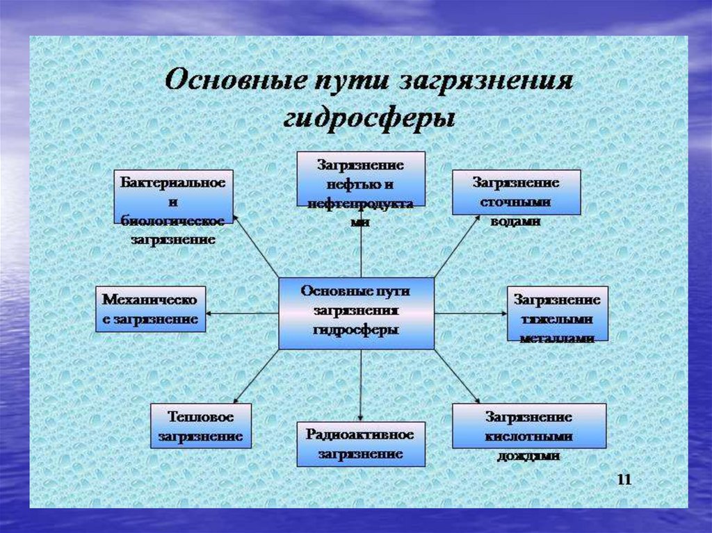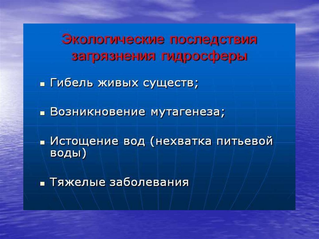 • Под загрязнением гидросферы то естьводоемов понимают снижение их биосферных