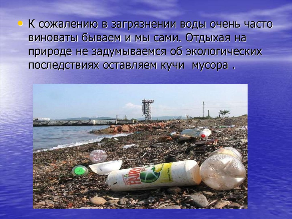 • К сожалению в загрязнении воды очень частовиноваты бываем и мы сами. Отдыхая на