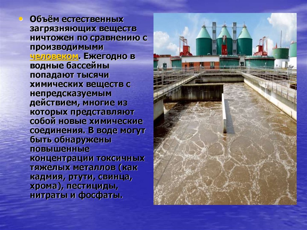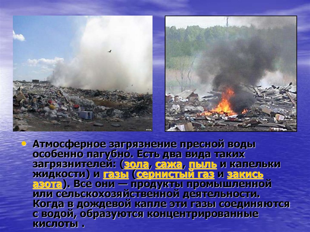 • Атмосферное загрязнение пресной водыособенно пагубно. Есть два вида таких