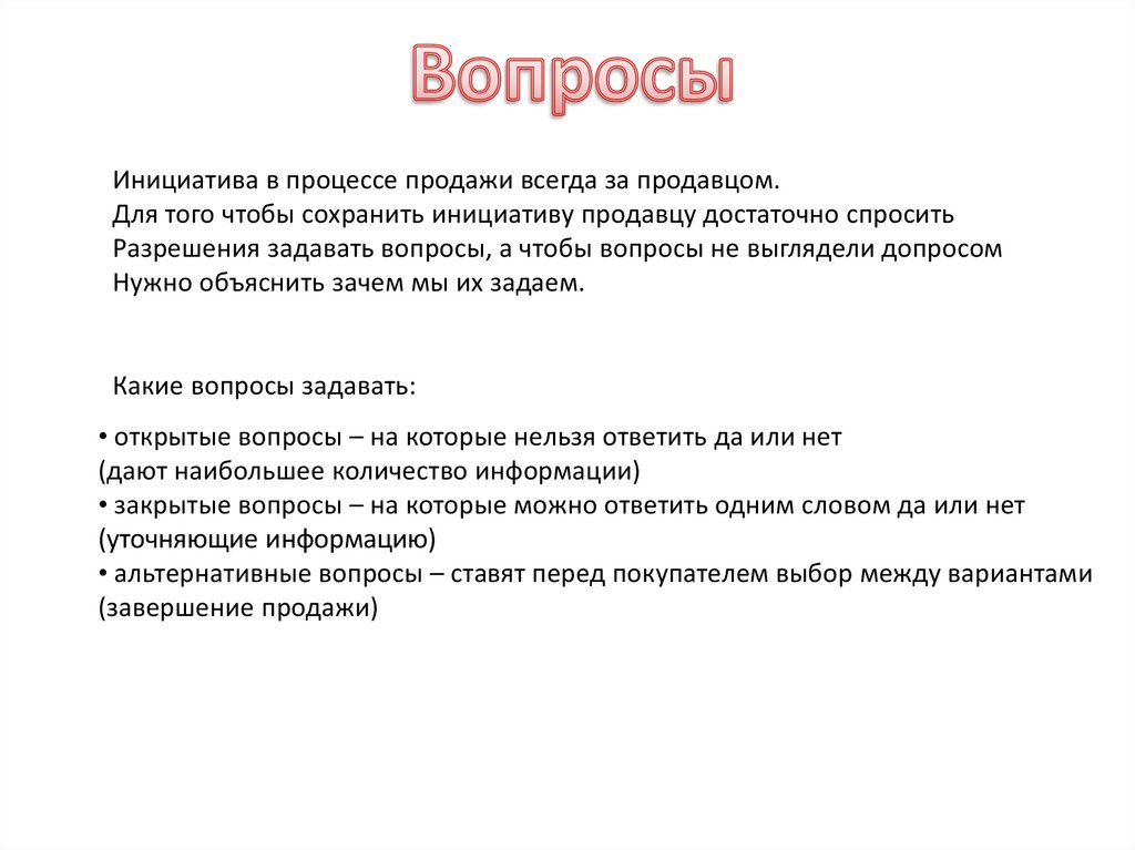 Инициатива в процессе продажи всегда за продавцом.Для того чтобы сохранить инициативу продавцу достаточно спросить