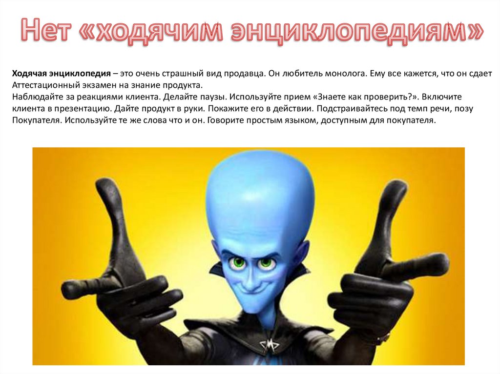 Ходячая энциклопедия – это очень страшный вид продавца. Он любитель монолога. Ему все кажется, что он сдаетАттестационный экзамен на знание продукта.