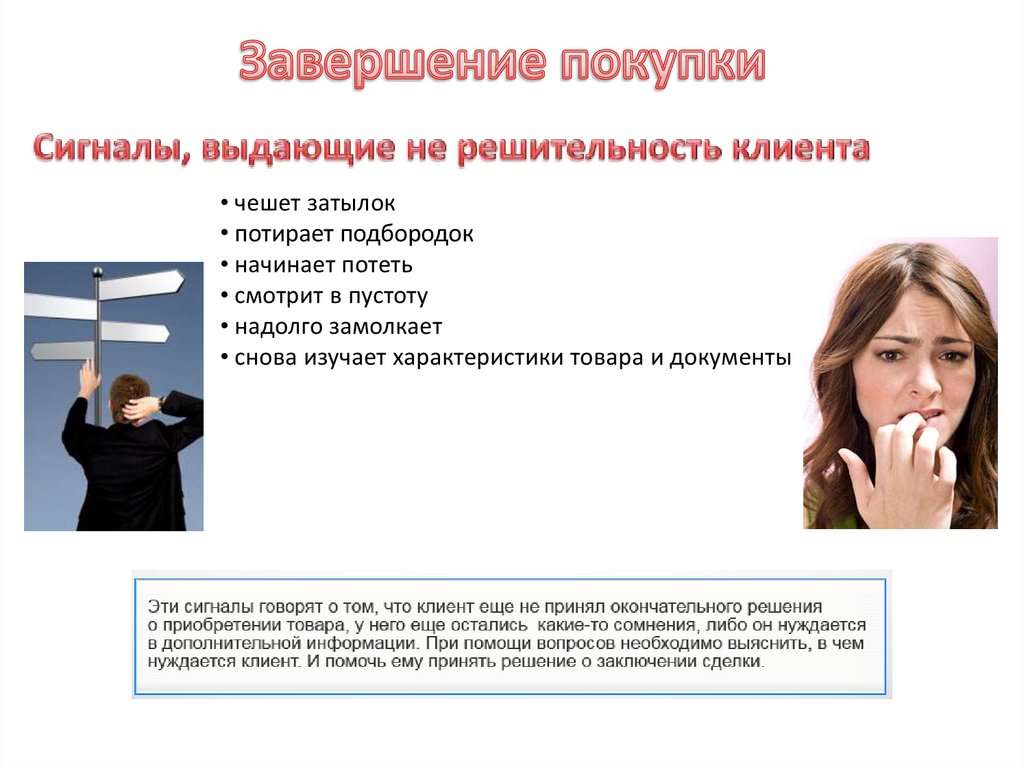 Если на любом этапе покупатель говорит, «беру!», не стоит тратить времяна переориентацию покупателя! Смело оформляйте им выбранный товар и,