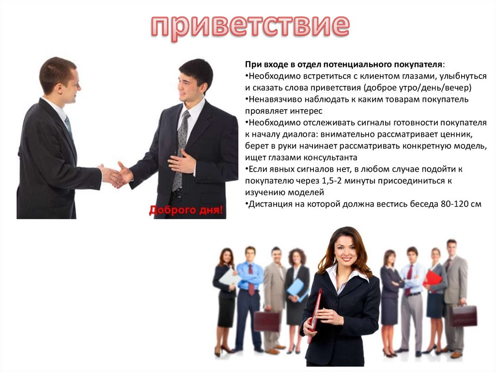 При входе в отдел потенциального покупателя:•Необходимо встретиться с клиентом глазами, улыбнуться