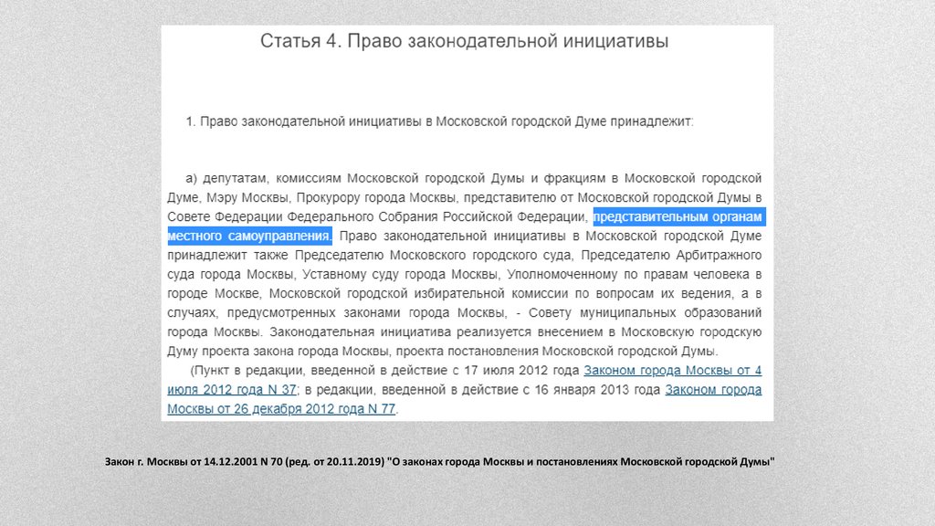 Закон г. Москвы от 14.12.2001 N 70 (ред. от 20.11.2019) "О законах города Москвы и постановлениях Московской городской Думы"4.